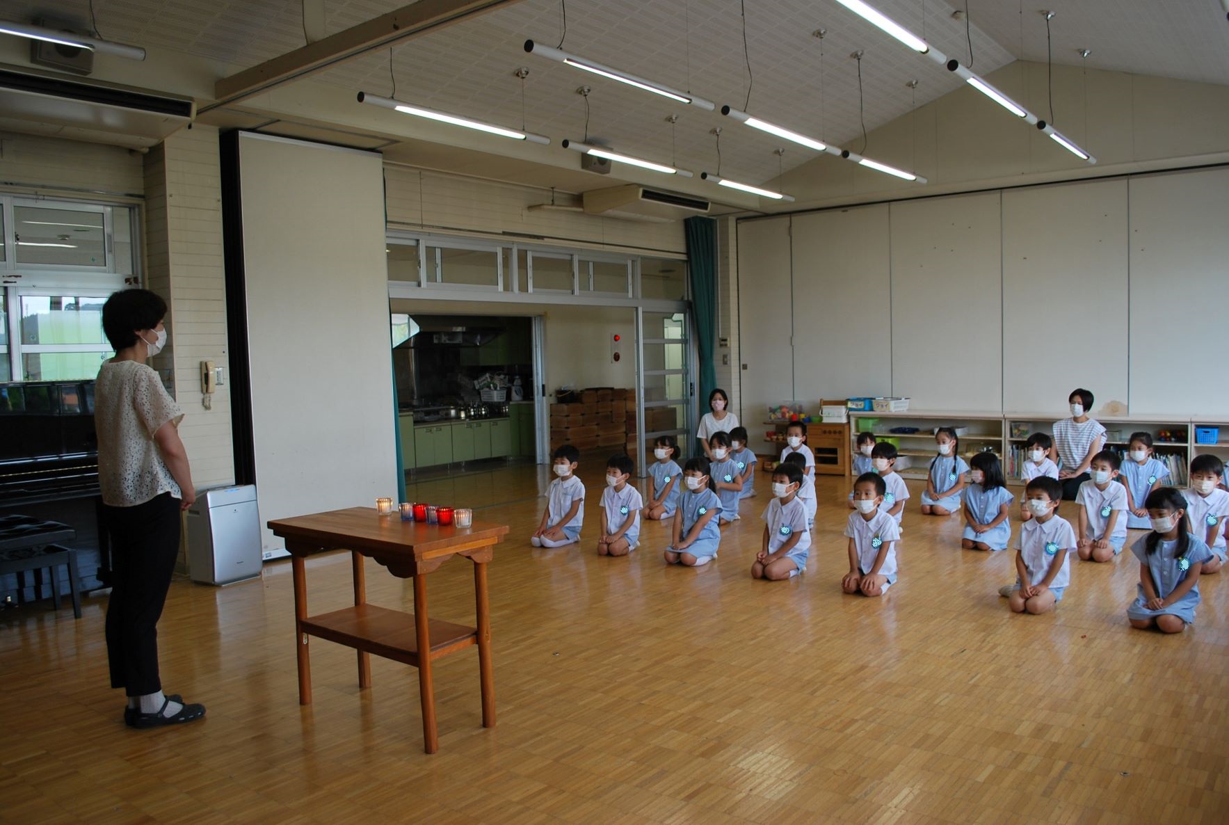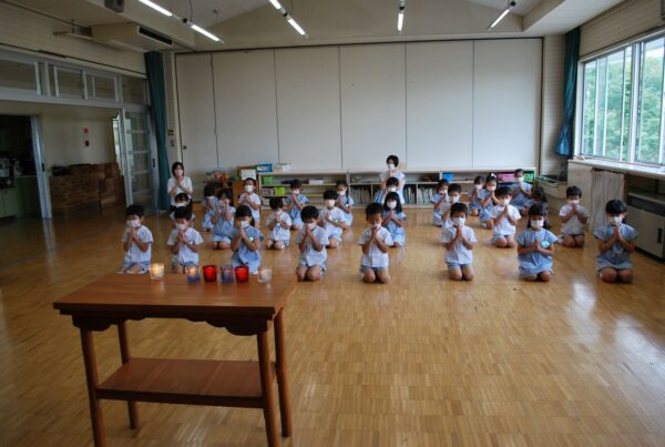 2021/9/1 2学期 始業式 長い夏休みを終え、2学期が始まりました。(写真は年長ゆりさんです)コロナ禍で、いろいろと規制がある中でも、子どもたちはいつもと変わらない元気いっぱいの笑顔で登園してきてくれました。始業式はクラス毎、短時間で行いました。今学期も感染予防を行いながら、できることを思いっきり楽しみたいと思います。 投稿ナビゲーション 運動会